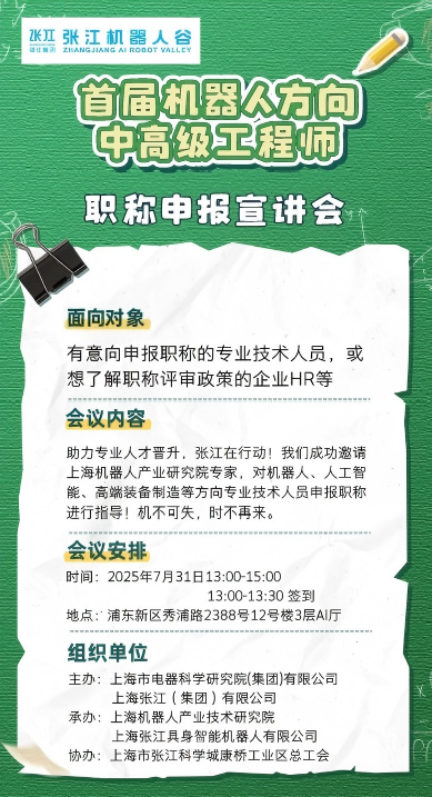 7月31日,为使本市各申报人员更清楚了解职称评审要求,kaiyun开云(中国)机器人有限公司官网联合张江机器人谷成功举办上海市首届工程系列数字技术专业职称申报政策宣讲会。会议通过申报范围、评审流程、材料准备、政策亮点等方面的深度解读,为机器人、智能制造等产业前沿领域专业技术人才提供权威申报指导。