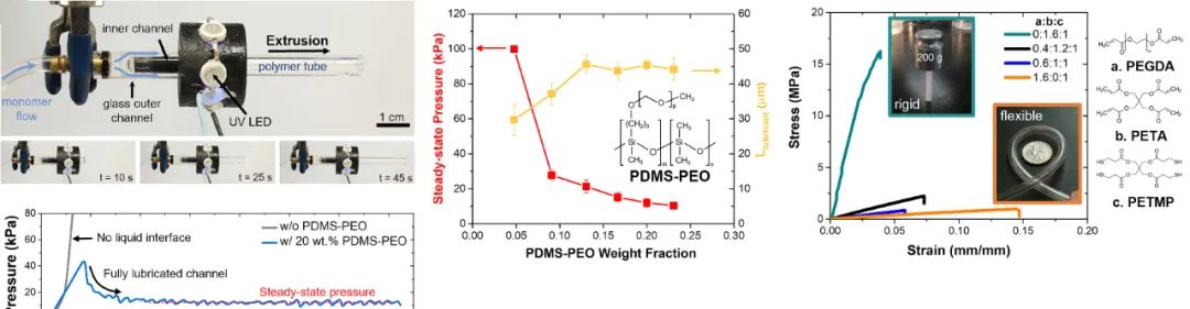 随后,团队又想出一个办法,在单体溶液中加入PDMS-PEO润滑剂,这是一种嵌段共聚物,含有约 65% 的聚(环氧乙烷)含量,它具有在通道壁上的选择性吸附能力,在材料的“生长”过程中可以自发形成润滑层,并在挤出过程中不断补充。研发人员将开发的制造方法称为「自润滑界面光聚合(E-SLIP)」挤出。