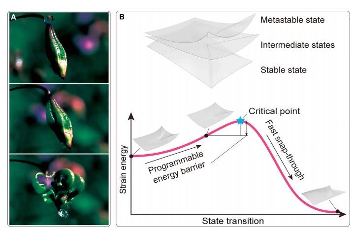 通过将特殊材料的片材折叠成特定的折痕图案,系统具有了稳定状态、亚稳定状态和无数的中间状态。当双稳态结构从其亚稳态转变为稳态时,存在一个临界点,此时存储的应变能达到最大值,同时结构会发生失稳,快速跃变至稳态。