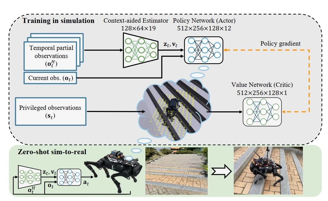 它主要由上下文估计网络和策略网络组成,前者通过惯性信息和关节信息隐式地估计地面信息、显式地估计机器人状态;然后将信息馈送到策略网络,生成最佳控制命令。